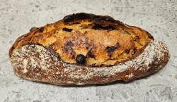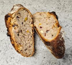 sur une base de pain de campagne au levain naturel, il est garni avec de graines de courge, amandes, pistaches, raisins, cranberries et abricots...