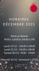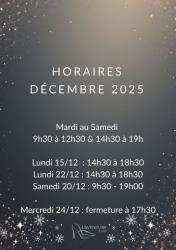 En plus des horaires habituels, la boutique sera ouverte les lundis 15/12 et 22/12 de 14h30 à 18h30 et le samedi 20/12 en journée continue.