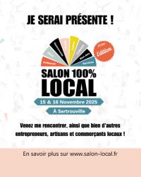 Je serai présente les 15 et 16 novembre au Salon 100% LOCAL de Sartrouville, un événement dédié aux artisans, entrepreneurs et acteurs du bien-être de notre région ✨ Vous pourrez me retrouver au stand 54, à l’étage, tout au long du week-end.